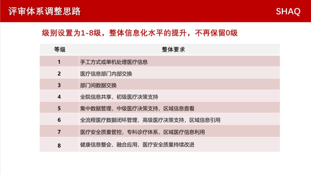 ? 對重點要求內容對應的級別重新規定。考慮信息化的快速發展,將部分高級別功能下移。比如中級邏輯檢查,包括姓名、診斷、年齡等檢查條件,全部調整為5級;安全要求從5-6級降為3-4級,增加消防、等保的基礎要求;增加個人信息保護、數據安全的要求。